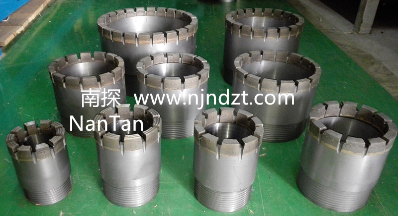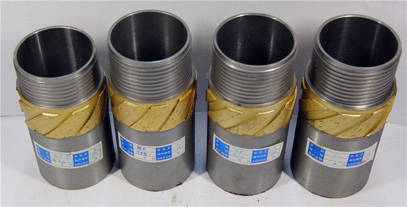 擴(kuò)孔器:連接在金剛石鉆頭與巖心管之間,起到擴(kuò)大孔徑和修整孔壁保證孔徑不縮小的一種鉆具。由于金剛石鉆頭直徑與巖心管外徑的尺寸相差很小,使孔壁與巖心管之間的間隙更加縮小,使過水受阻,并易造成卡鉆。金剛石擴(kuò)孔器是一短柱狀管體,上下鋼體部分有絲扣分別與鉆頭和巖心管相連,中間部分是覆蓋含金剛石的胎體,其外徑略大于金剛石鉆頭直徑(2毫米左右),胎體側(cè)表面上有過水水槽,使水流通過。在極堅(jiān)硬易磨性的巖層,也有使用兩個(gè)和多個(gè)擴(kuò)孔器,除一個(gè)裝在鉆頭的上部以外,其余的間隔地裝在巖心管之間。